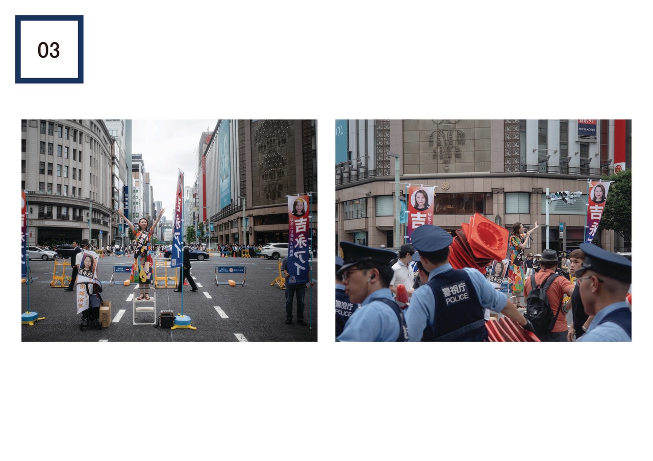 本作は、告示日の7月5日から開票日前日19日までの選挙運動期間に、街頭演説に立った候補者と東京の街並みを記録した写真集である。撮影にあたっては、候補者の知名度や情勢報道(当落予想)に左右されず、候補者陣営がSNSに投稿する遊説予定を参照して現地に赴き、できるだけ多くの候補者(26名)を偏りなく記録した。